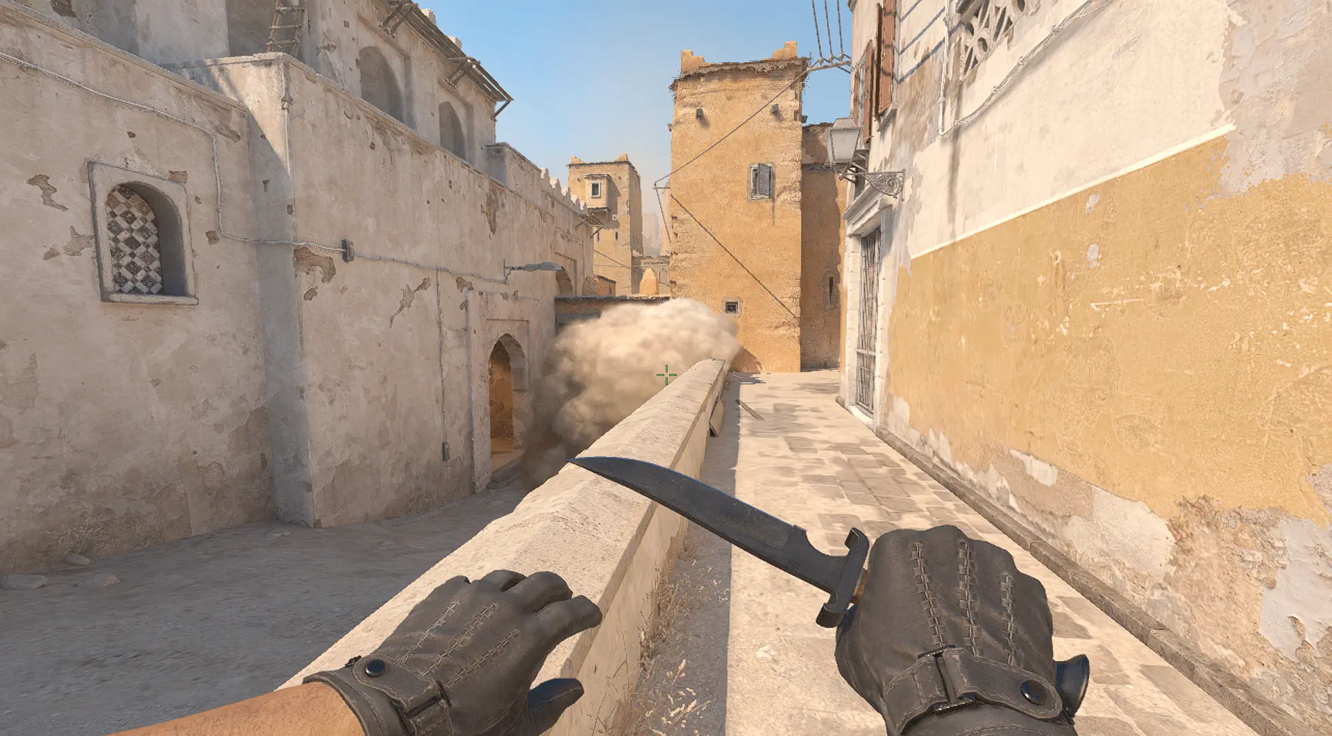 - Далее целимся в угол между зданиями и кидаем смок с помощью jumpthrow
