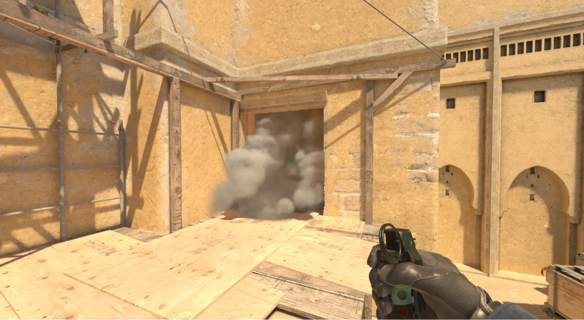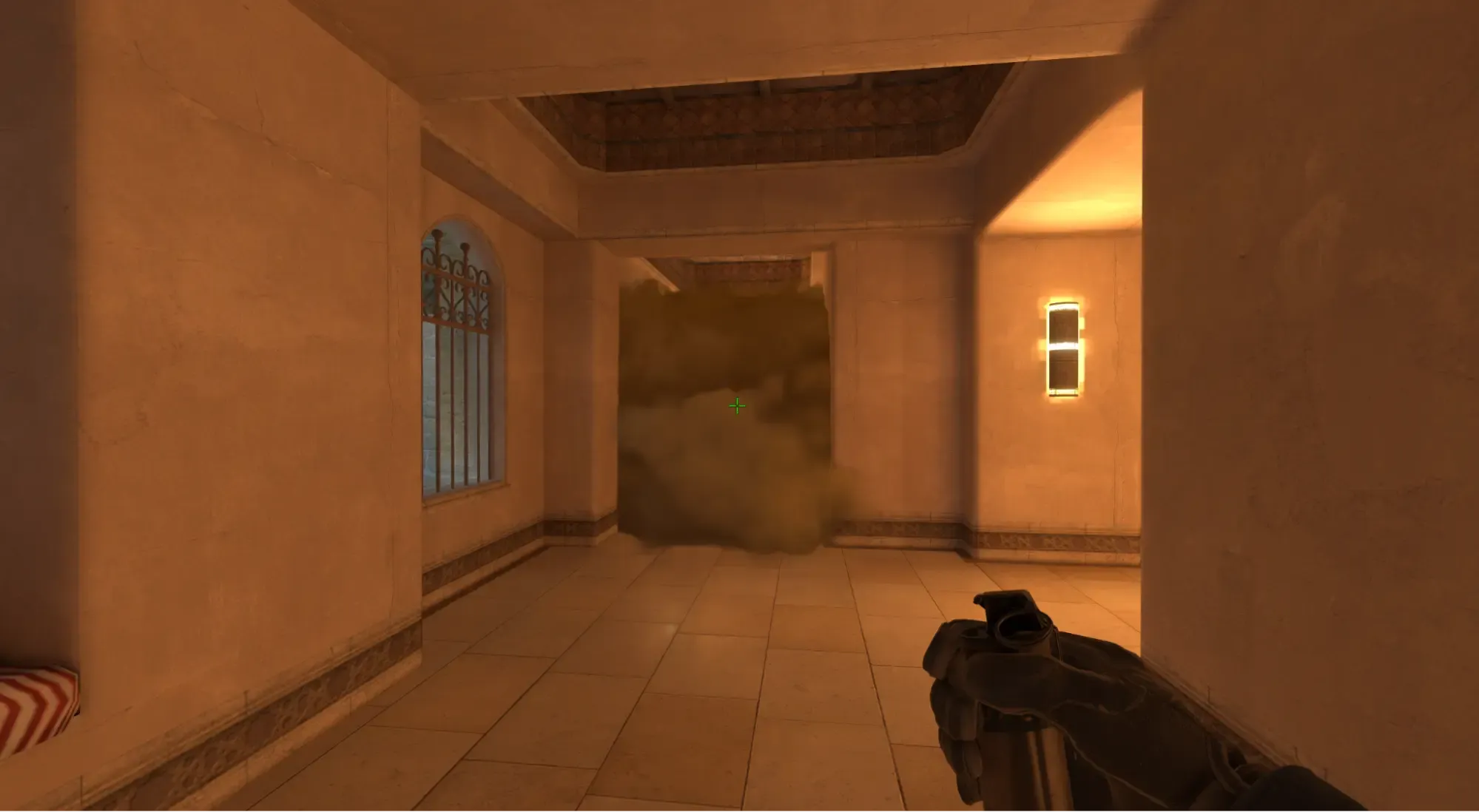 Дымовая граната падает прямо в ковры. Это позволяет выиграть время, если противник осторожен и не решится выходить через дым. Допустим, команда говорит, что это А, и вы делаете перетяжку через шорт. При этом можете помочь им перекрыть ковры. Для её выполнения нужно: