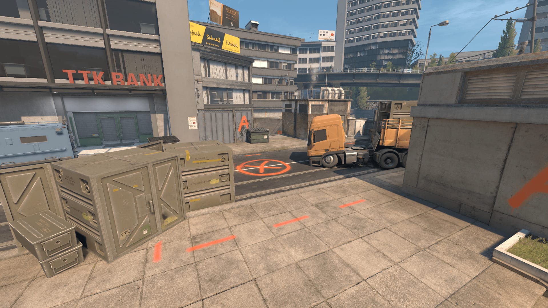 А вот и особенность, которую мы упоминали выше. Место, обведённое красным пунктиром, является СТ-респауном и A-плентом. Также здесь можно увидеть популярные позиции, такие как фура, банк, мусорка и инкассатор.