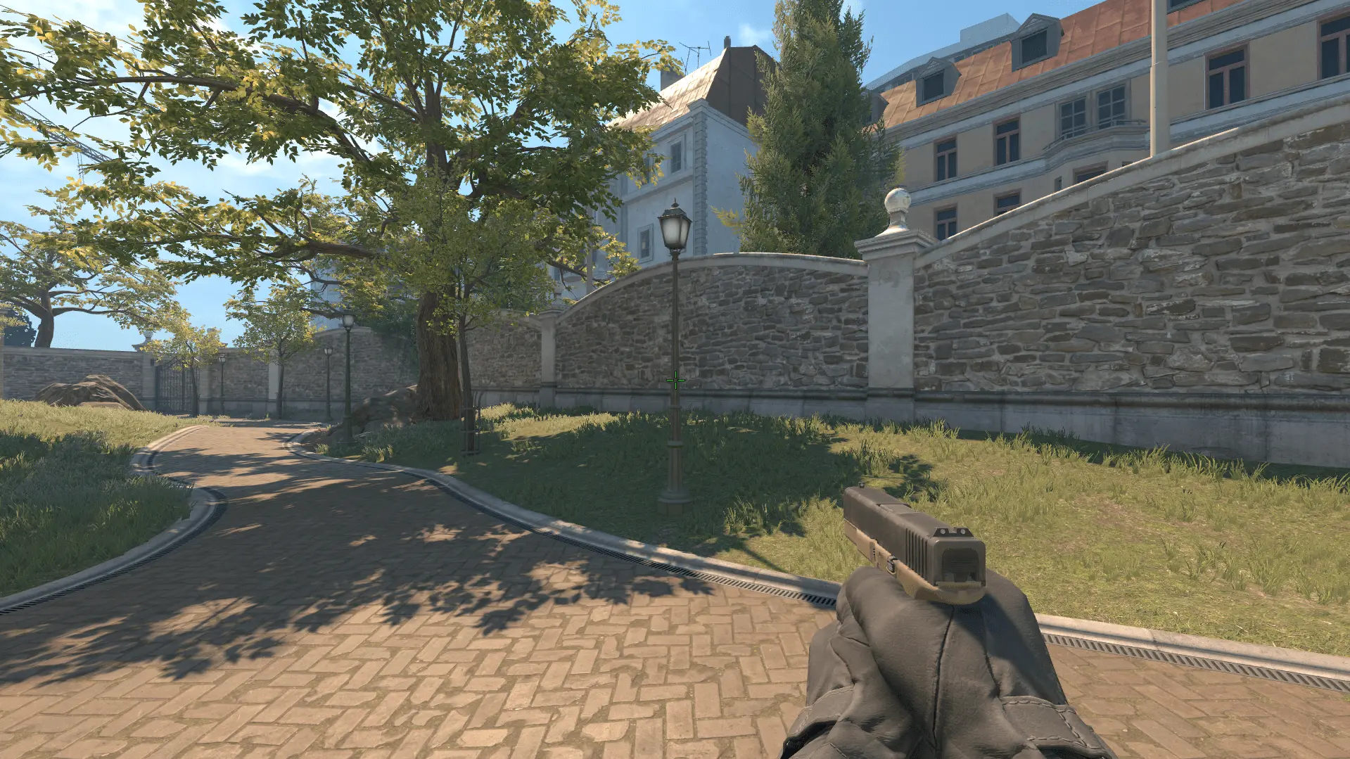 - Подходим впритык к третьему фонарю (если начинать счет с дерева) и ставим прицел на одну из внешней стороны фонаря