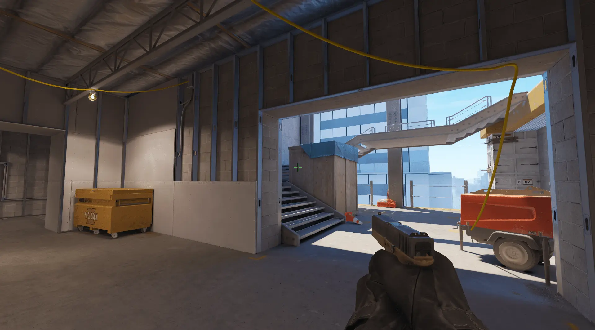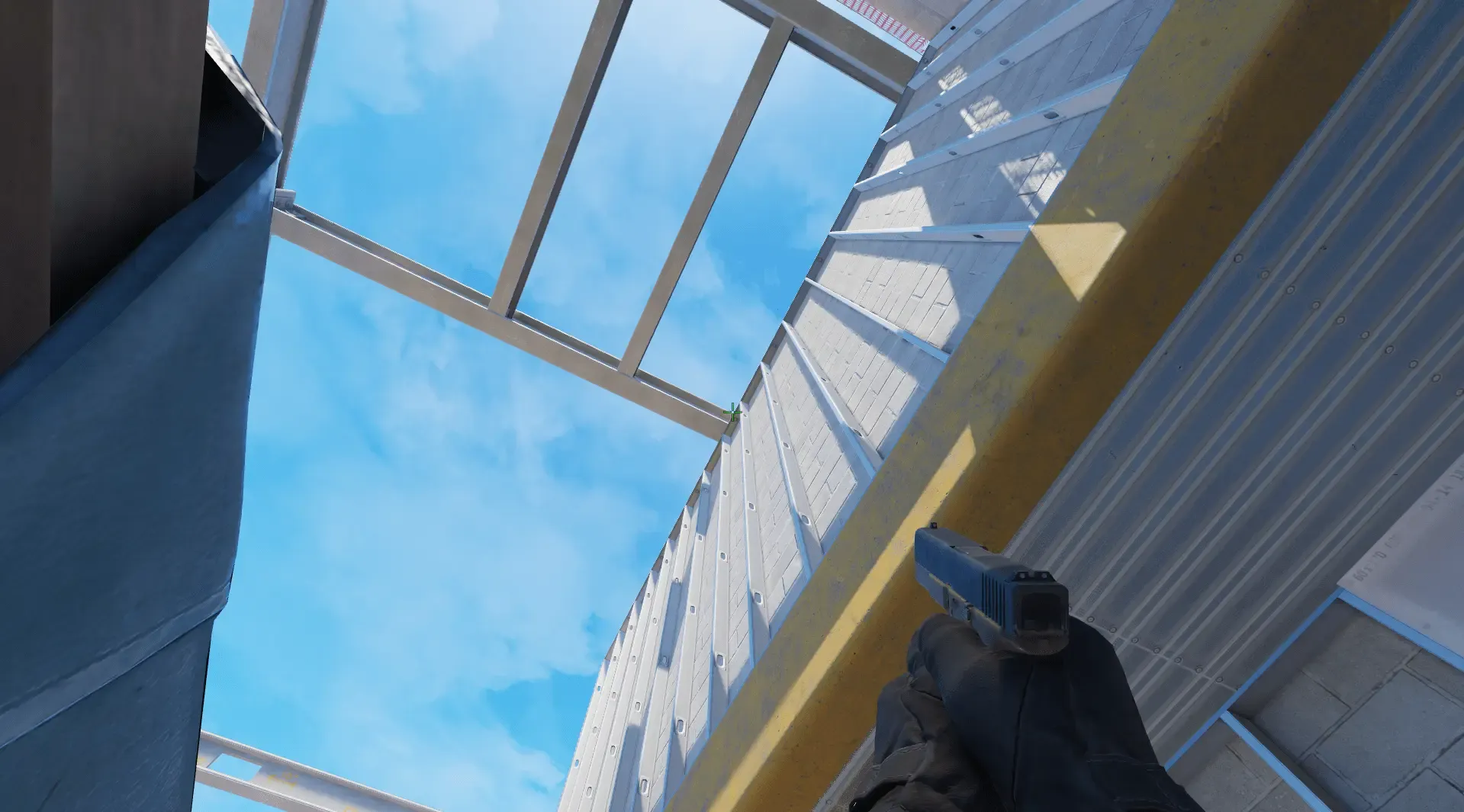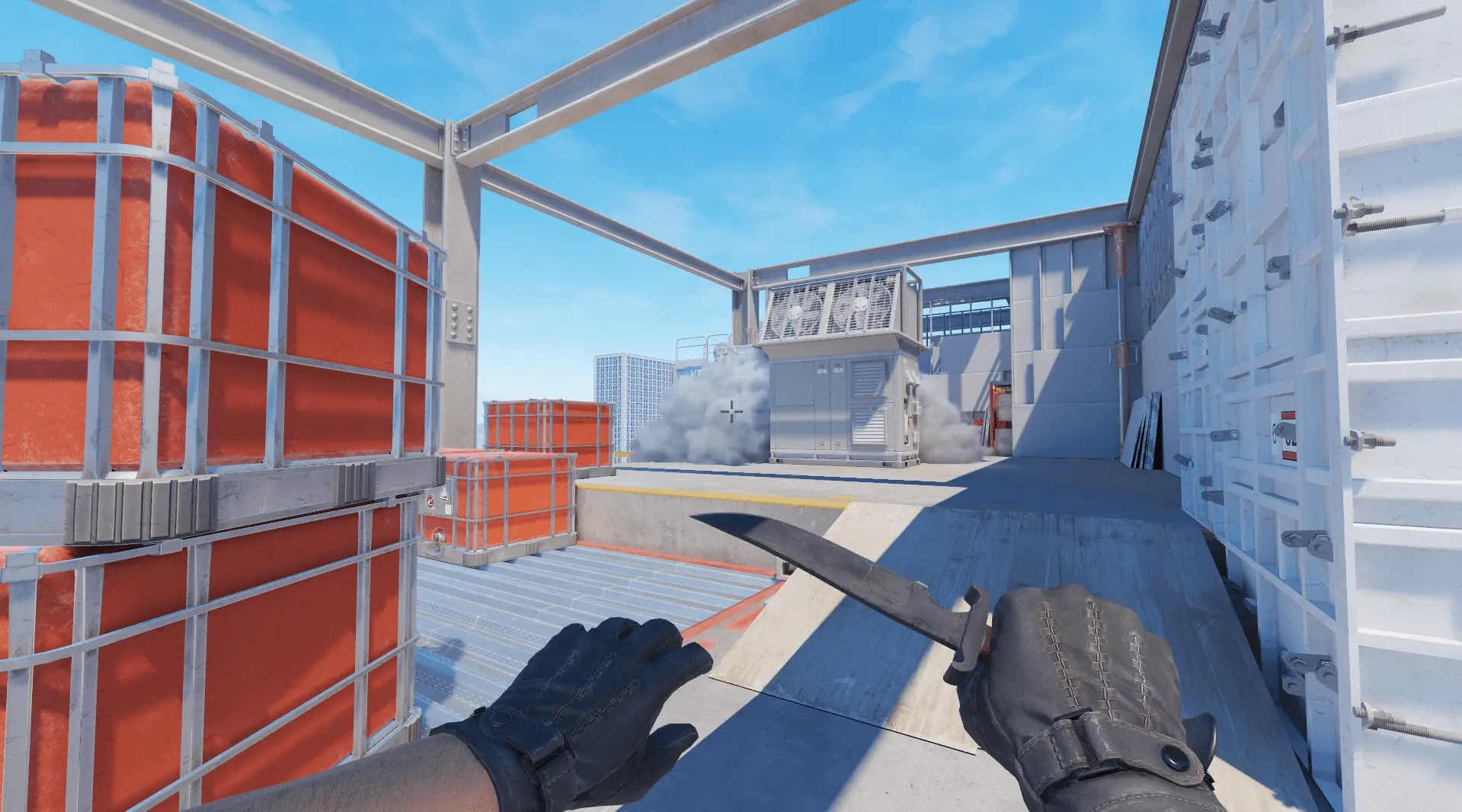 - Разворачиваемся и все так же с приседом целимся на конец видимой части металлической балки. Держим прицел как на фото, встаем и кидаем гранату