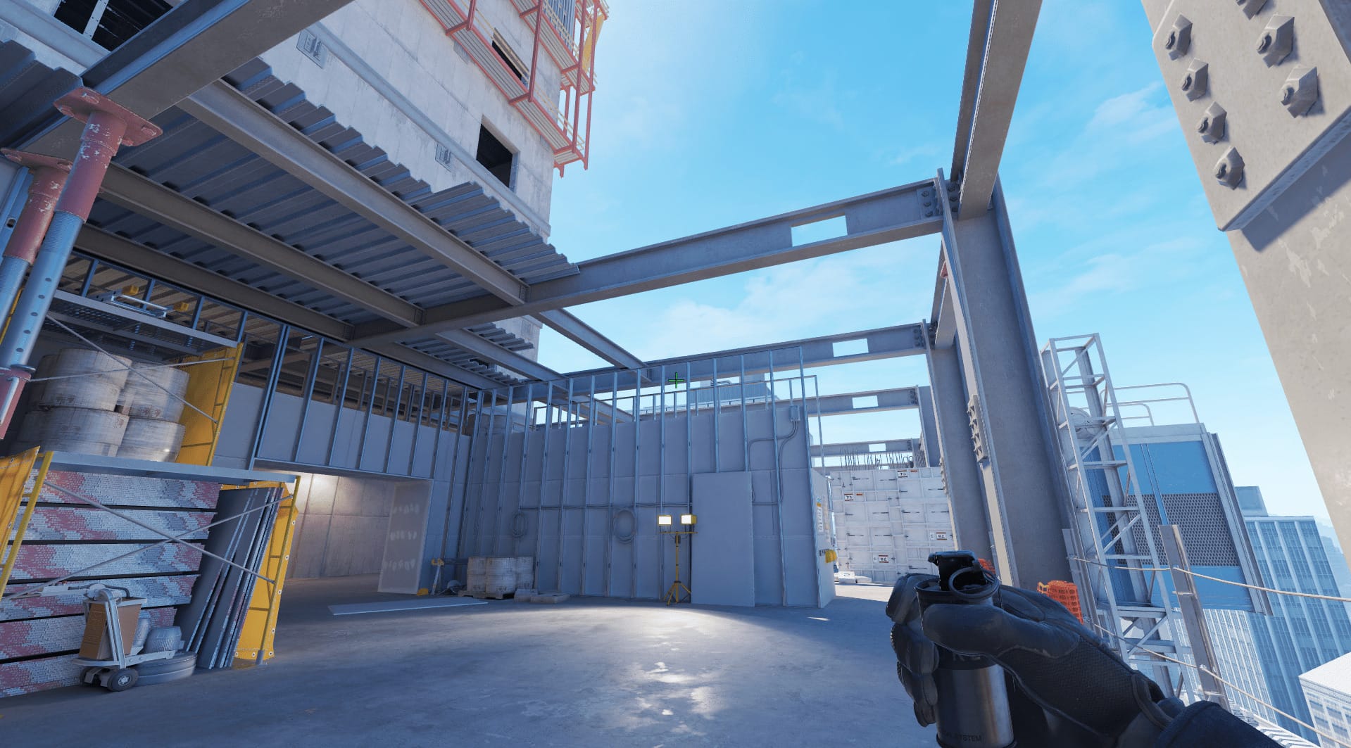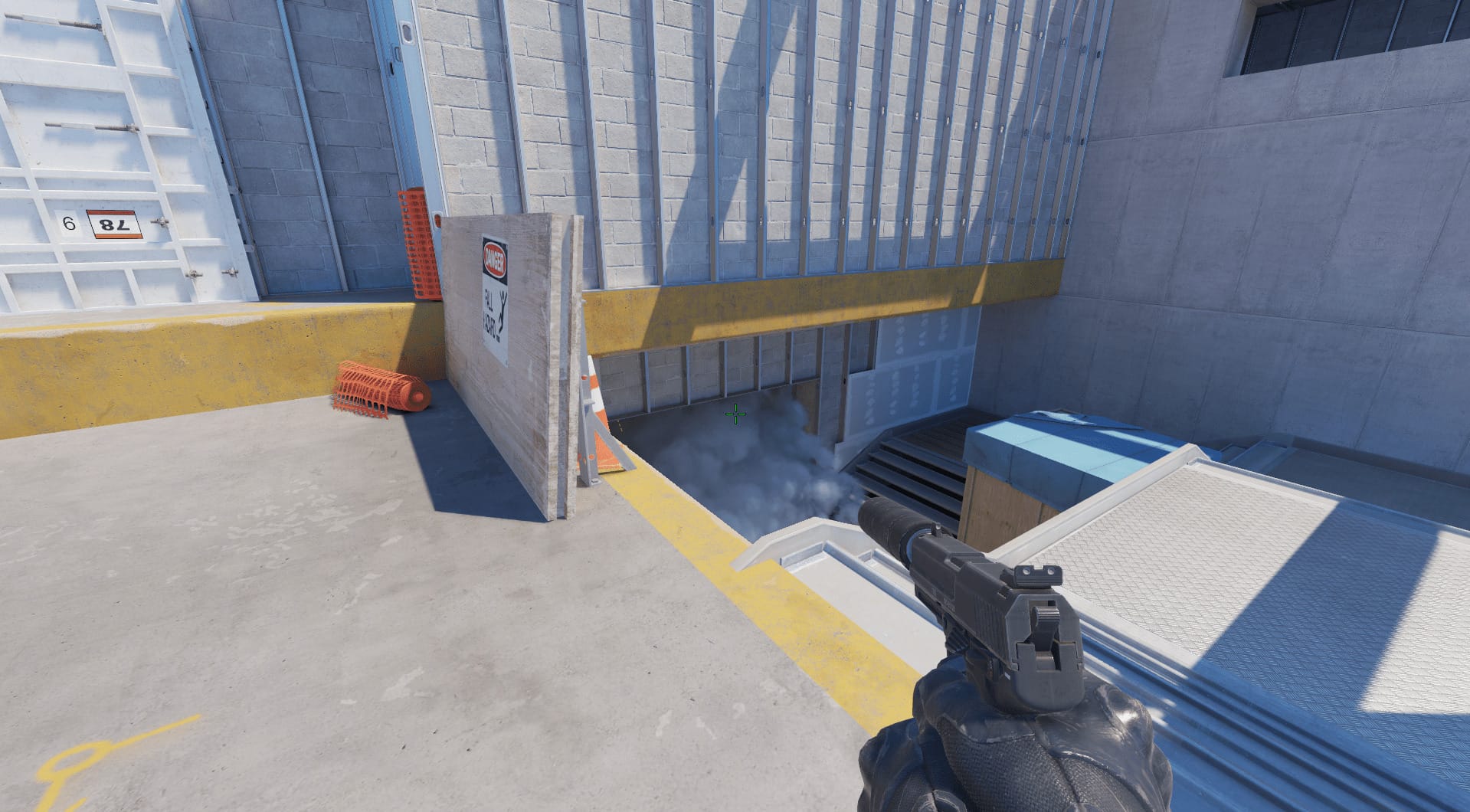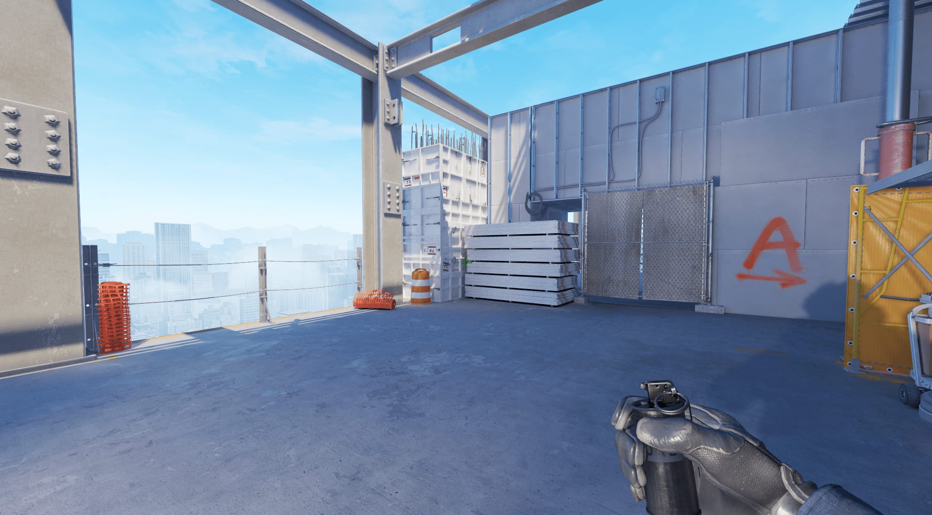 - Поставить прицел на середину нижней стороны “прямоугольника”, который появляется вследствие пересечения металлических балок. И кинуть смок с прыжком