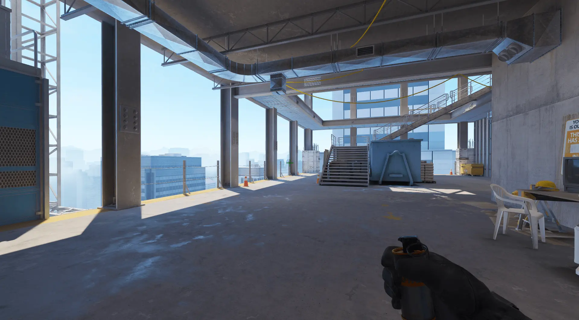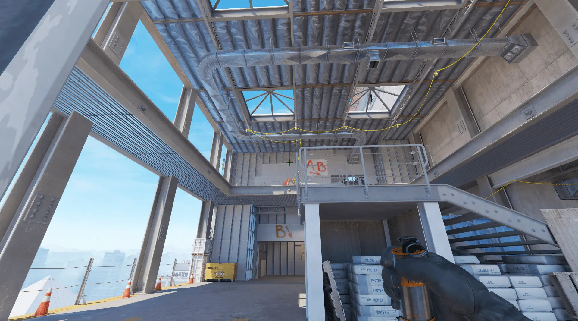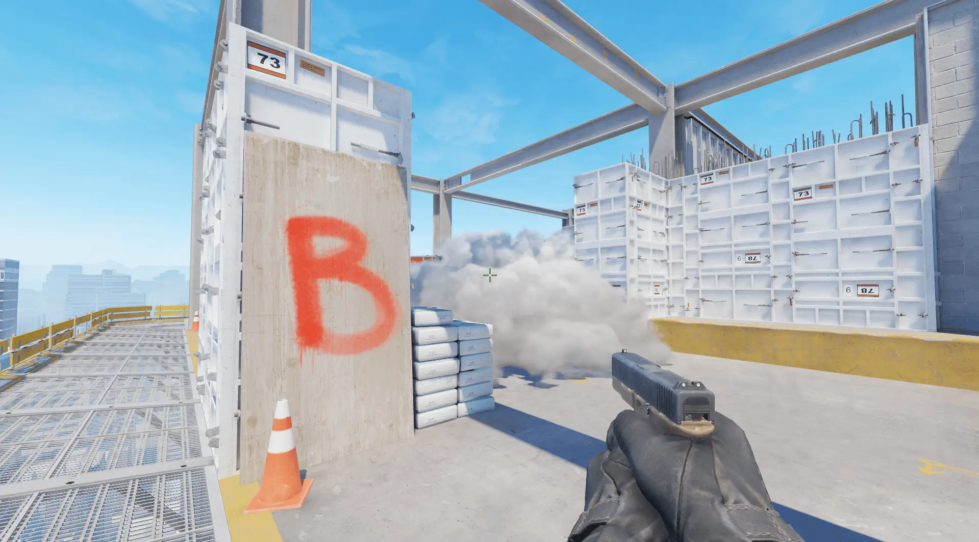 - Стараемся навести прицел на первую железную балку слева от перил. Бросаем смоук с прыжком