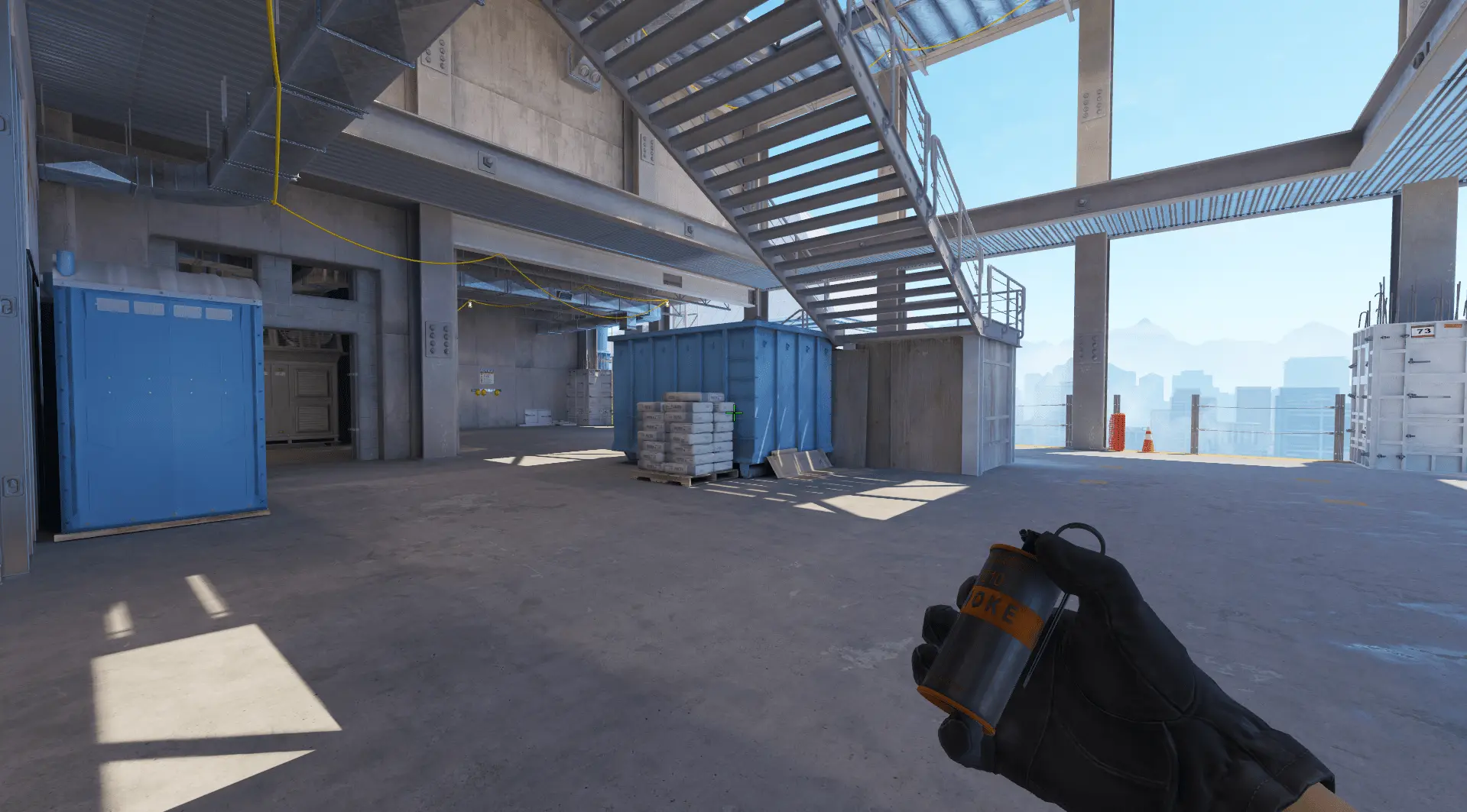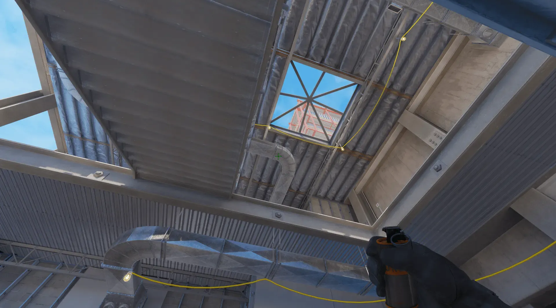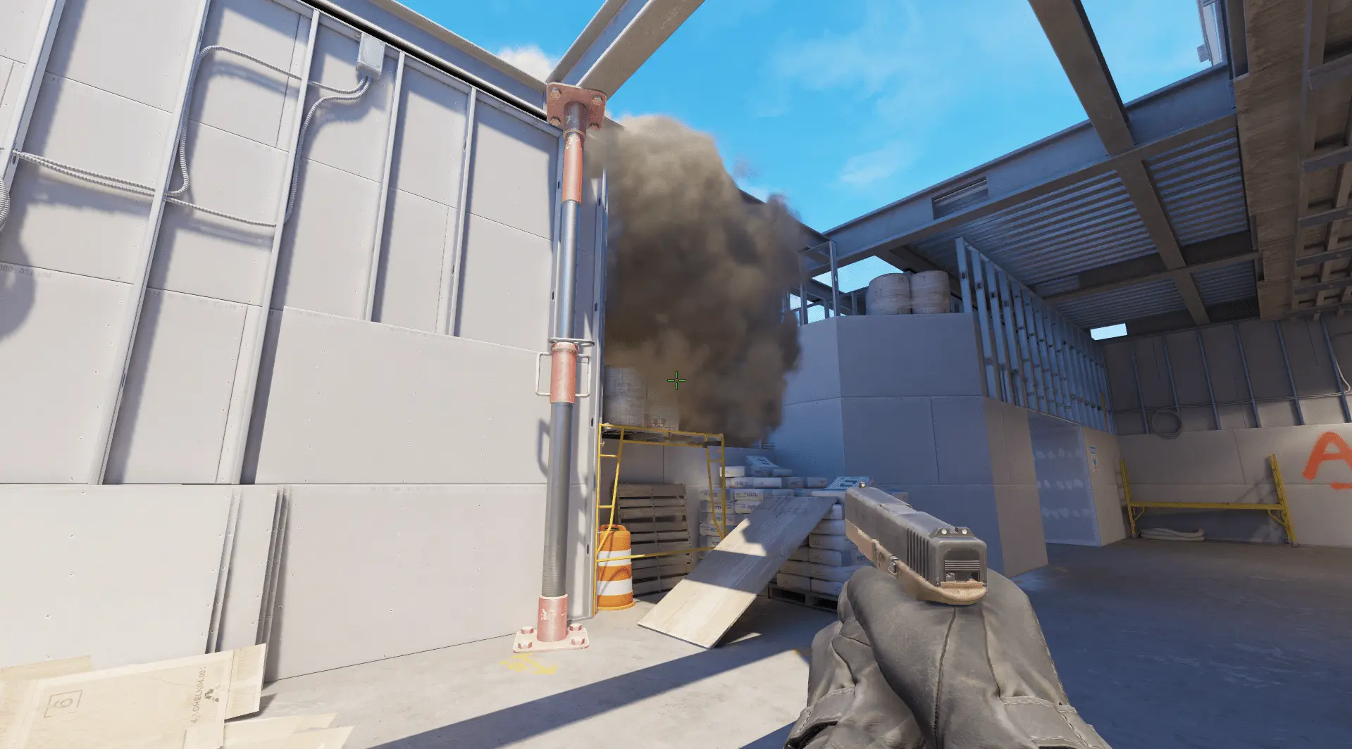 - Поворачиваем камеру на вверх и находим линию на трубе, условно делим ее пополам и опускаем прицел чуть ниже середины. Бросаем дым с прыжком